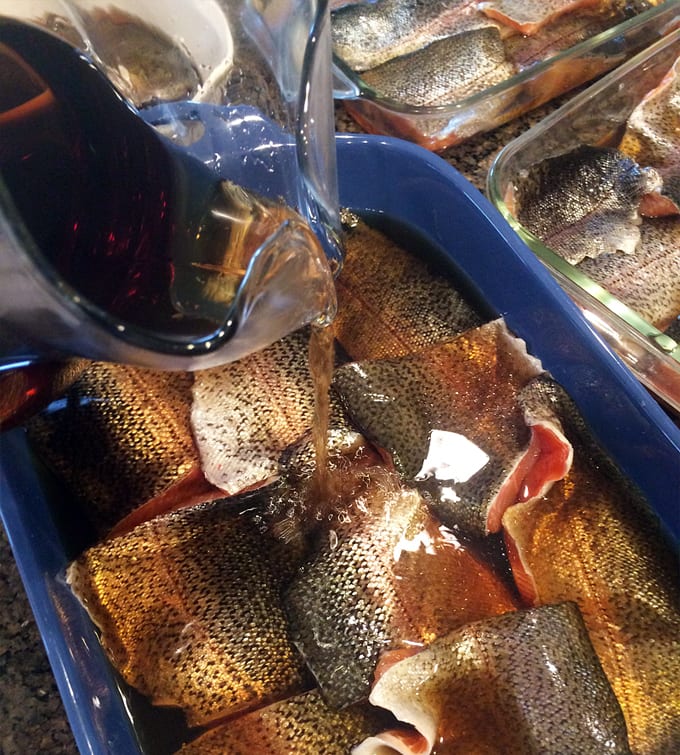 I have found that brining the fish with salt, brown sugar and peach brandy – gives the fish subtle hints of sweetness. I also baste the trout with Mr. Yoshidas Sweet and Savory Marinade to add another layer of sweet to each and every bite of the fish. If you can’t find the marinade, no problem. Teriyaki glazes will work just as good.